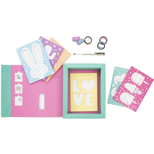 Contents: 6 printed cards with cut out windows, 5 different rolls of glitter tape, 1 glitter gel pen, storage box